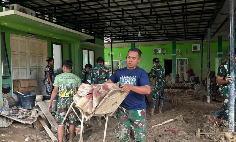 Aceh Tamiang – TNI melalui Brigif 25/Siwah Kodam Iskandar Muda mengerahkan personel untuk melaksanakan pembersihan fasilitas pelayanan kesehatan pasca banjir di Puskesmas Desa Kota Lintang, Kecamatan Kota Kuala Simpang, Kabupaten Aceh Tamiang, Aceh, Senin (15/12/2025).