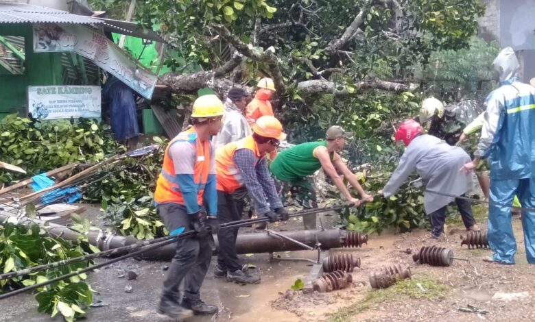 Tak hanya menghalangi jalan, pohon tersebut juga menimpa tiang listrik serta dua warung milik Bejan dan Mulud, warga RT 50 RW 14.