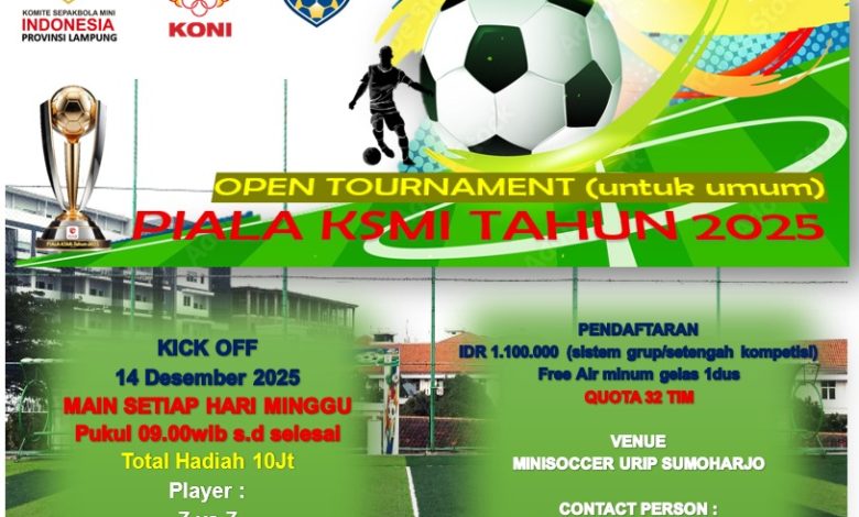 LAMPUNG || Koranprogresif.id – Turnamen Sepak Bola Piala KSMI (KOMITE SEPAKBOLA MINI INDONESIA) Provinsi Lampung akan dimulai pada 14 Desember 2025 yang akan dilaksanakan di lapangan mini soccer Urip Sumoharjo di Jl. Urip Sumoharjo no 200 Gunung Sulah, Wayhalim, Kota Bandar Lampung.
