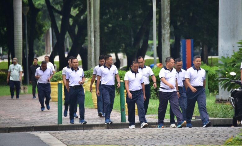 Kegiatan olahraga bersama diawali dengan pengecekan kesehatan serta senam peregangan dilanjutkan dengan jalan sehat dan lari bersama di lapangan silang Monas.