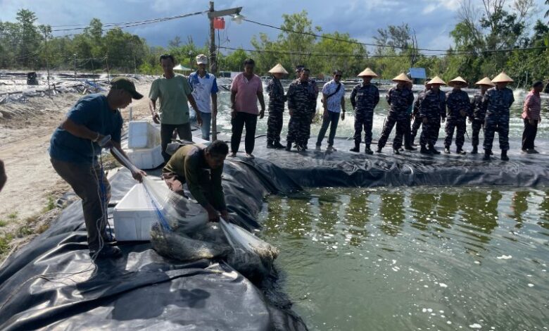 Dabo Singkep,- Komandan Lantamal IV Batam Laksamana Pertama TNI Berkat Widjanarko, S.E., M.Tr.Opsla., laksanakan panen bersama Kelompok Tani Tambak Udang Bestari binaan Staf Potmar Lanal DBS, di Dusun 03 Kebun Niur, Desa Batu Berdaun, Kecamatan Singkep, Kabupaten Lingga, Selasa (01/07/2025).