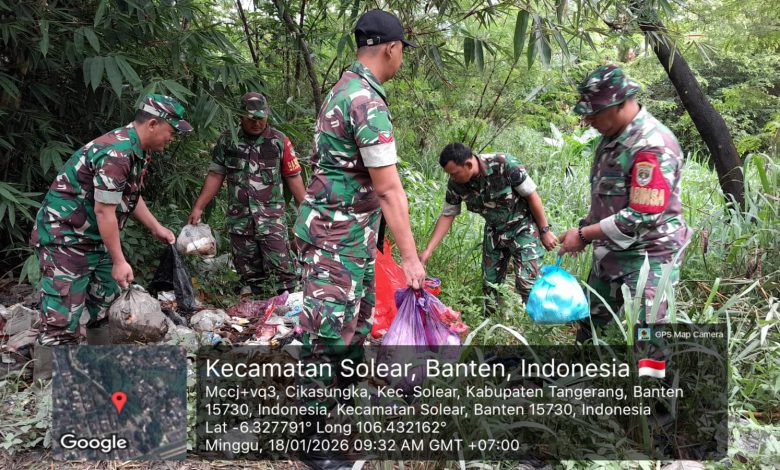 Tigaraksa- Sebagai wujud nyata kepedulian TNI terhadap kebersihan lingkungan sekaligus bagian dari pelaksanaan tugas pembinaan teritorial (binter), Serma Suhenda Babinsa Koramil 13/Cisoka, Kodim 0510/Trs kerja bakti membersihkan sampah di PerumbBukut Cikasungka, Kecamatan Solear Kabupaten Tangerang, Minggu (18/01/2026).